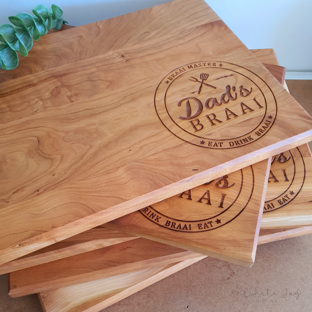 Beautiful cherry OR blackwood cutting board. Price includes custom laser engraving and creation of artwork for basic design. Additional costs may be levied if extensive design is required.