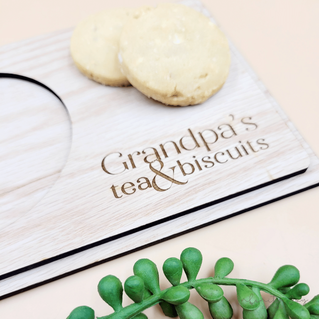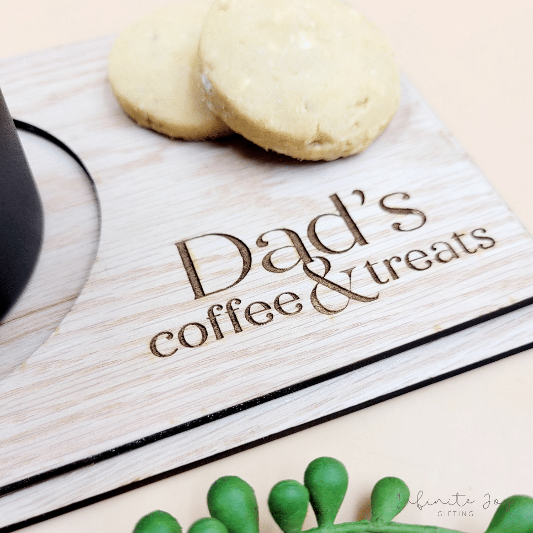 Wooden, personalised tray with a special place for your coffee. Laser engraved on oak veneer wood. Size: 180x120mm