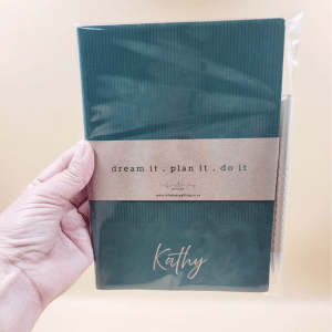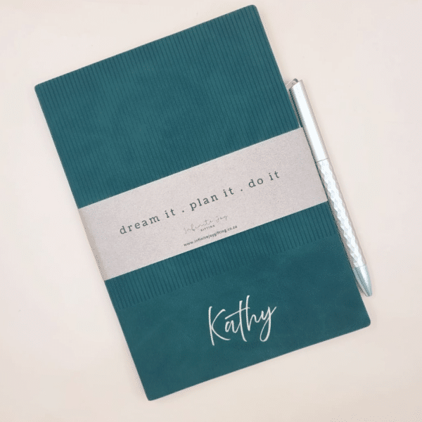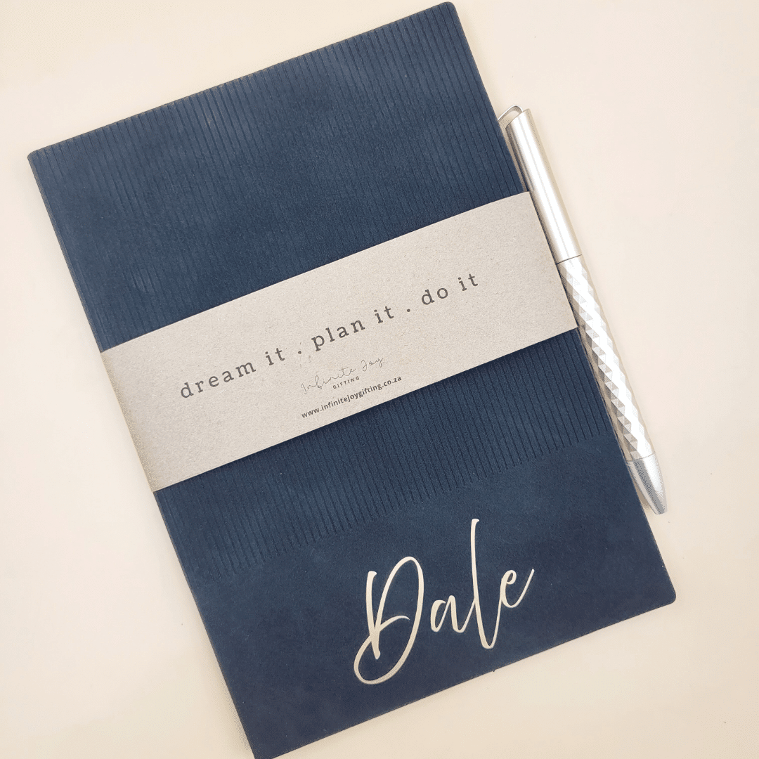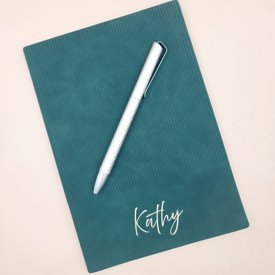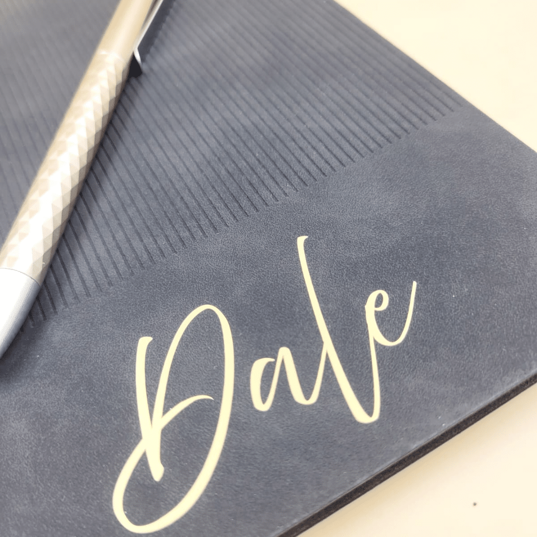 The A5 softcover notebook features a luxurious velvet-like textured cover with a subtle lined pattern, giving it a refined and premium feel. Each notebook is personalised with gold heat-transfer vinyl, creating a striking and elegant finish that makes every piece unique.