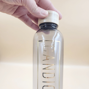 The screw-on plastic lid with a bamboo casing adds a stylish natural touch, blending beautifully with the RPET body. Each bottle includes chrome vinyl personalisation, making it uniquely yours or perfect as a meaningful gift.