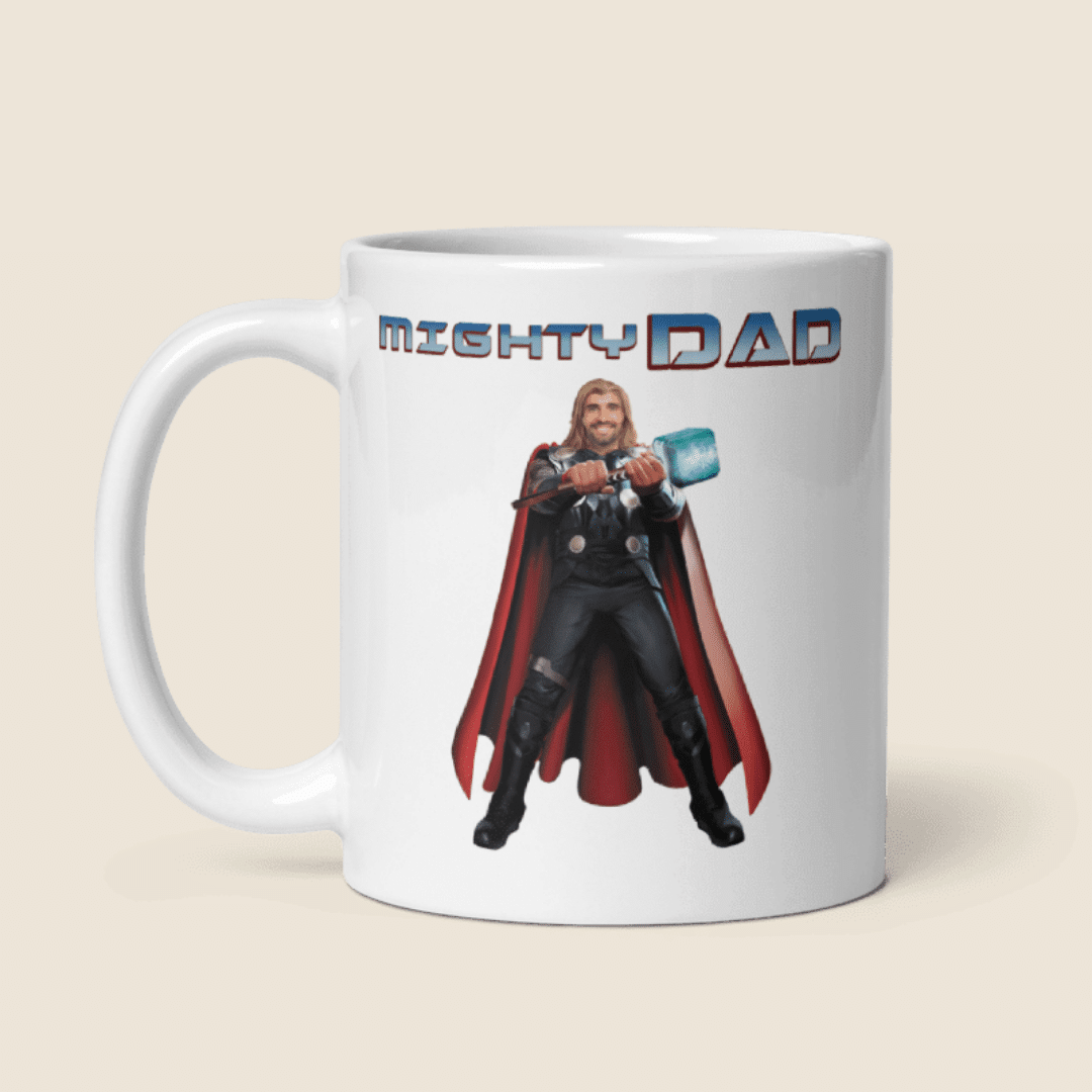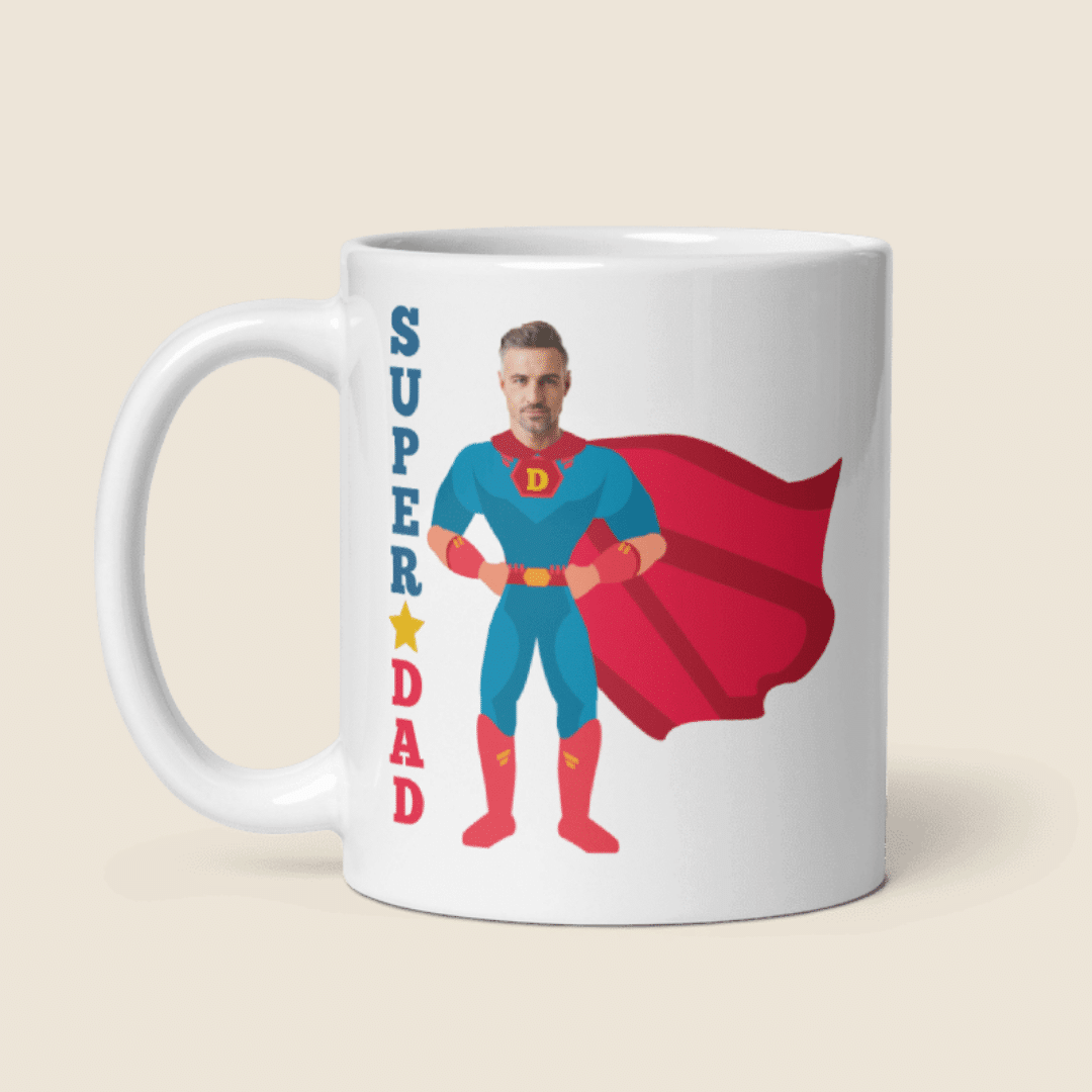 Turn your dad into the superhero he truly is! This custom-printed white ceramic mug features a bold, comic-style superhero design — with his actual face superimposed onto the hero’s body.