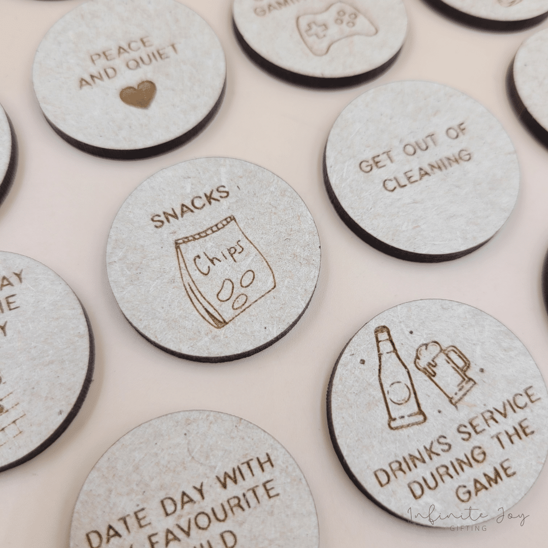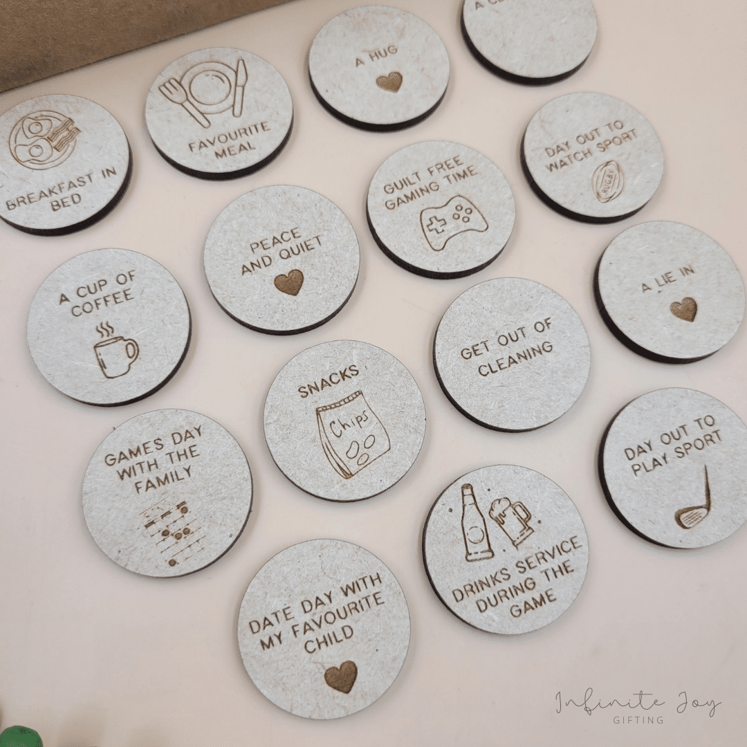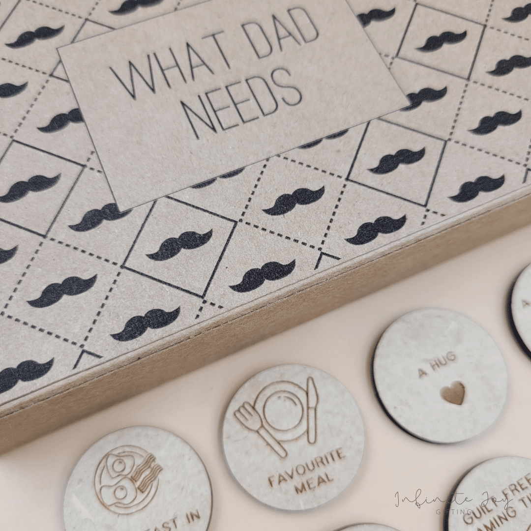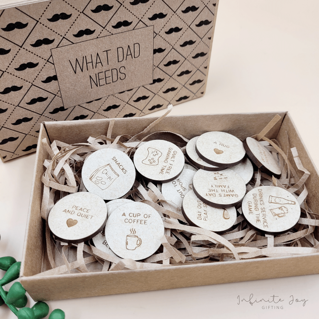 Cute way to remind your kids what dad need :). Including 15 wooden tokens, in a kraft box with print.