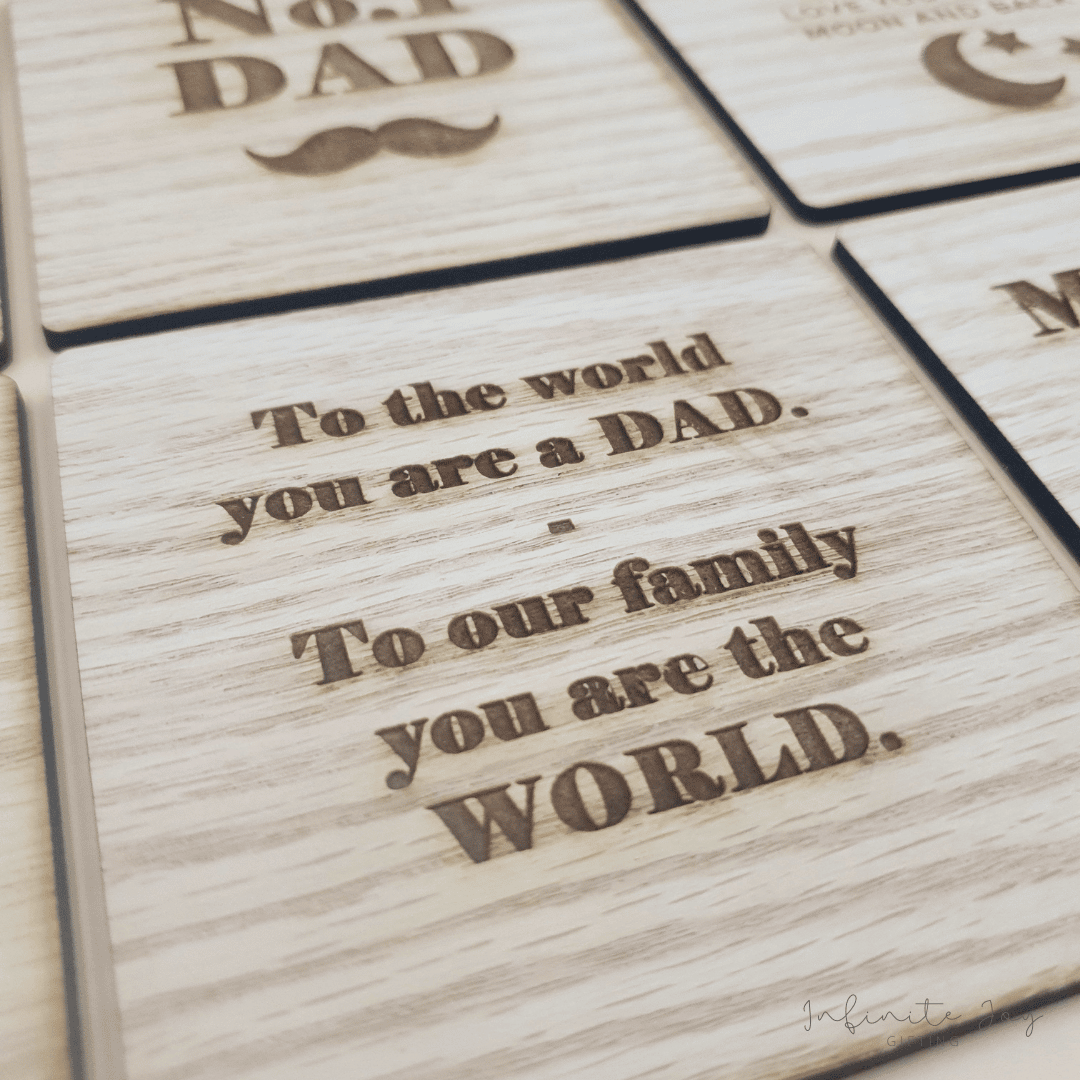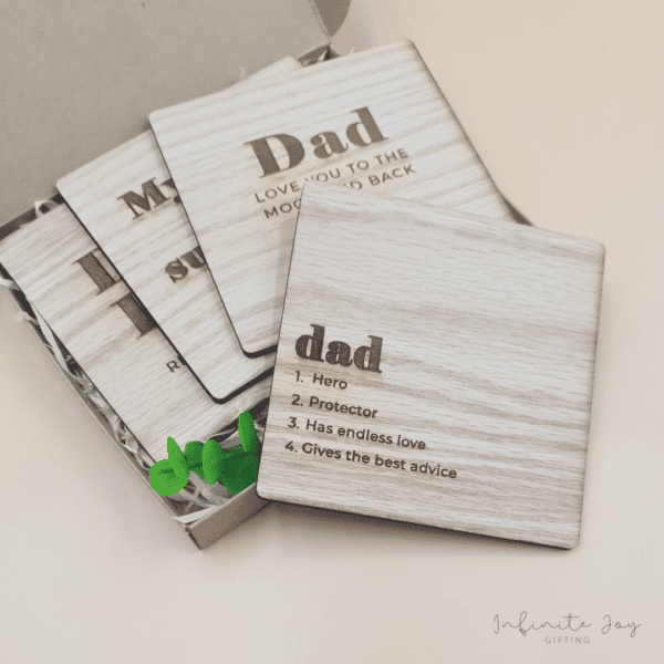Set of 4 wooden coasters, laser cut and engraved on 3mm oak veneer wood. Choose 4 designs from our range of 6 Father’s Day coasters. Presented in a gift box with twine and tag.